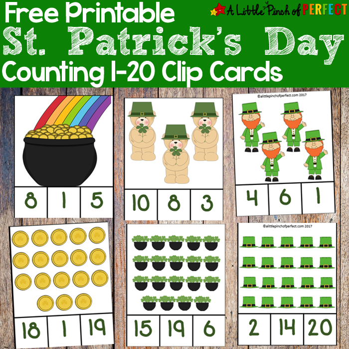 Visit our Blog to find more Details about the Activities: https://alittlepinchofperfect.com/free-printable-st-patricks-day-clip-cards-counting-1-20/